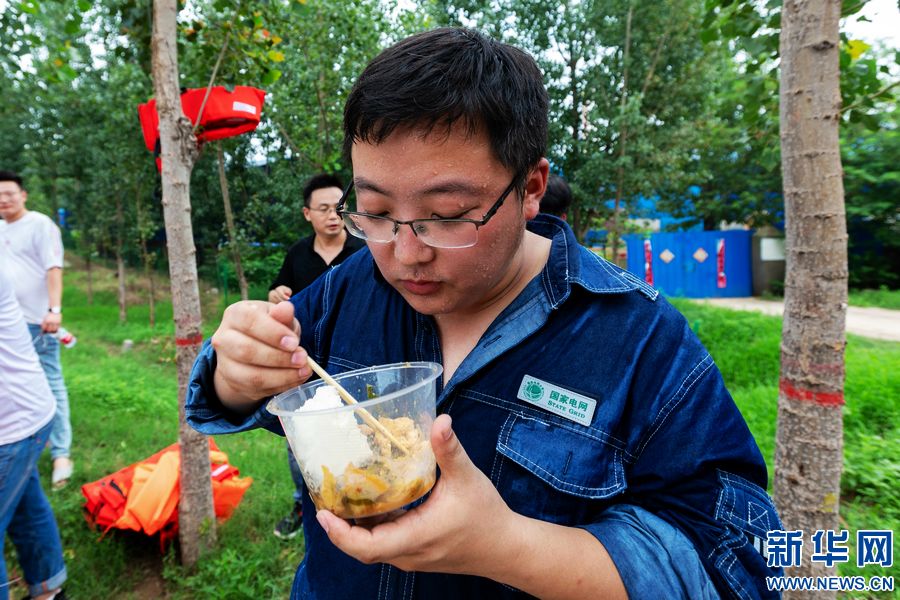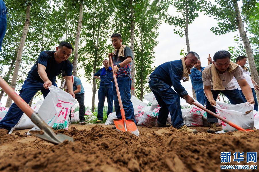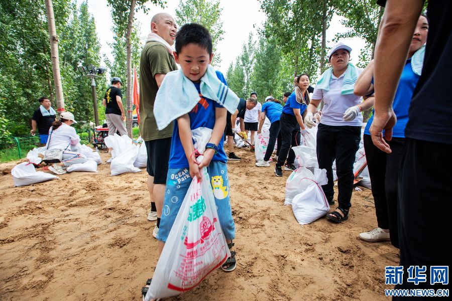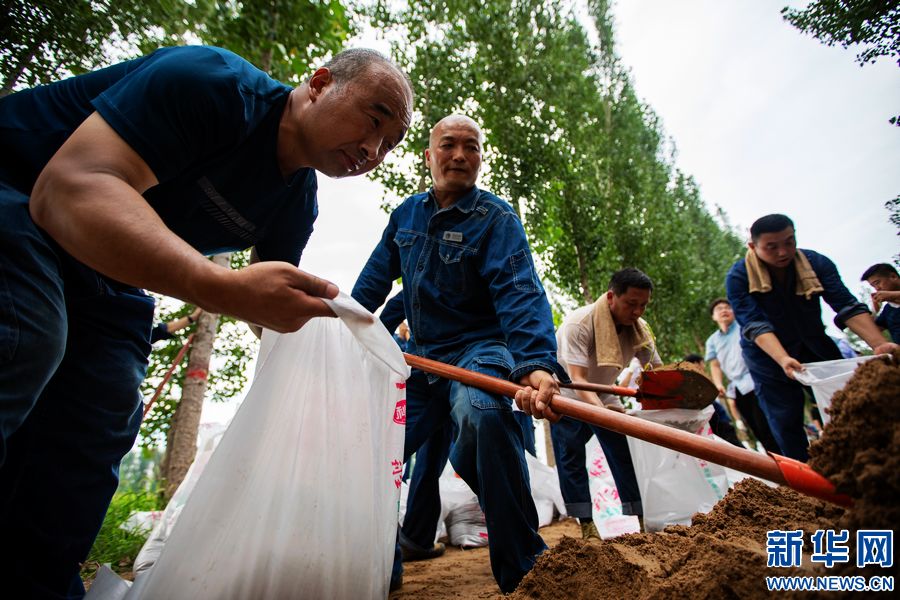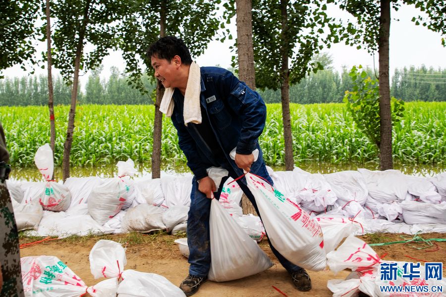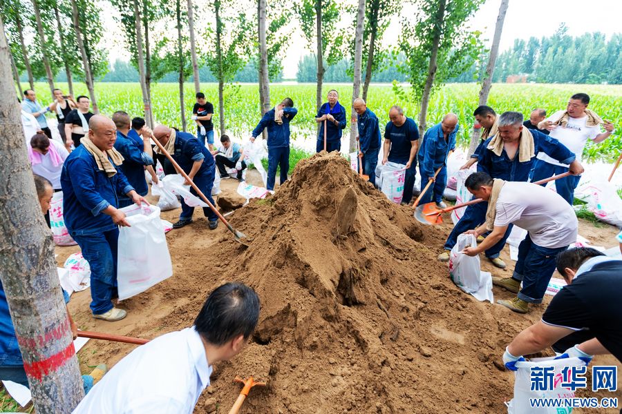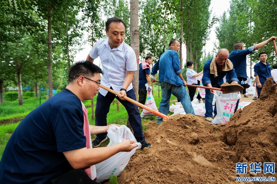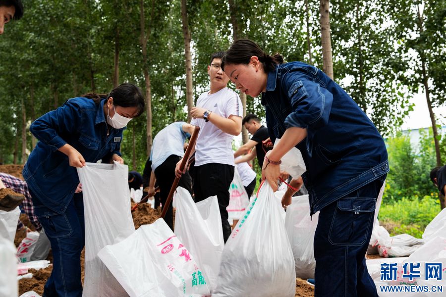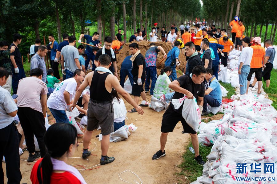 当日,卫河滑县大堤急需沙袋加固。国网滑县供电公司迅速组织70余名抢险队员,奔赴卫河大桥东岸河堤抢险。大堤上,供电抢险队与当地救援队、志愿者以及群众争分夺秒地装运沙袋,加固堤坝。他们,就是我们身边的平凡英雄。新华网发(文锟 王亚方 摄)