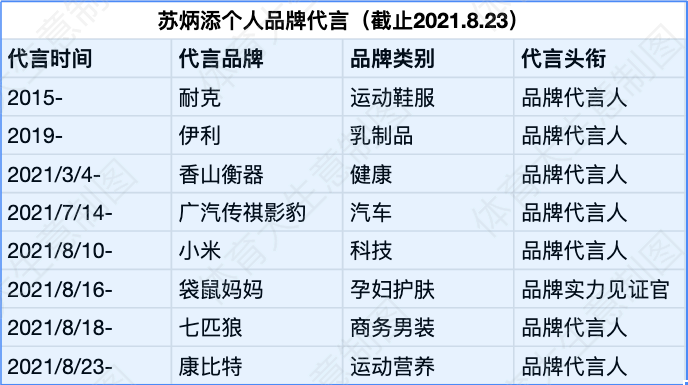 8月23日,中国百米飞人苏炳添宣布成为运动营养品牌康比特的代言人。在过去的13天里,苏炳添一口气拿下小米、七匹狼、袋鼠妈妈、康比特4个品牌的商务代言,其中3家为上市公司,个人商业潜力进一步释放。