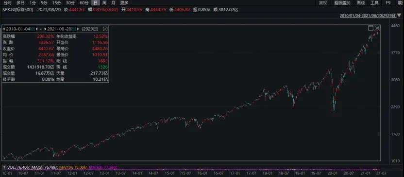 但在美股十年长牛的大背景下,风险仿佛是切蛋糕时不甚损失的一点奶油,甜蜜诱惑在前,这些都变成了忽略不计。10年回测,以标普500为参考的美股年化收益率已经超过12.5%,没赶上这波红利的年轻人早已蠢蠢欲动。