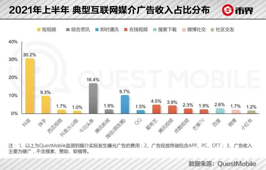 据QuestMobile发布的2021年上半年报告,主要以硬广投放做统计的话,在典型互联网媒介的广告收入分布上,抖音占比达到30.2%,微博占比仅为1.7%。