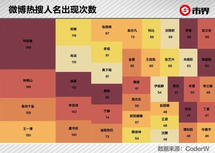 程序员CoderW统计了2020年的35901条微博热搜数据,热搜次数最多的40个人里大部分都是娱乐圈人士。 比如,因涉嫌强奸罪被批捕的吴亦凡出现过73次,肖战出现过115次,郑爽出现过119次。