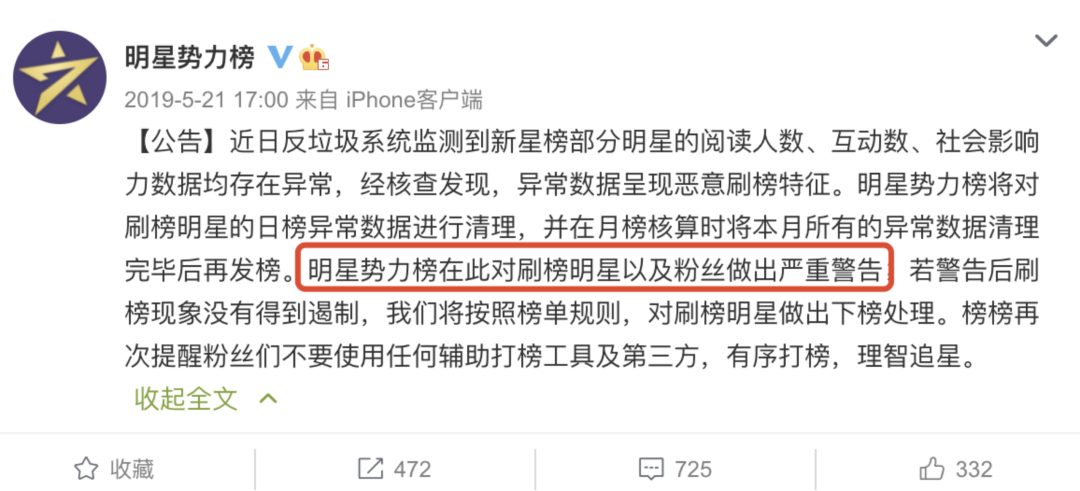 (微博曾警告明星粉丝不要刷榜)