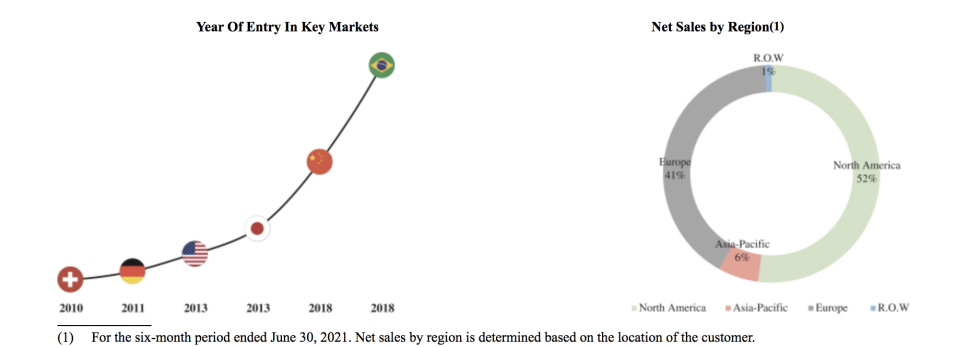 2020年,北美、欧洲、亚太、以及全球其他国家和地区的销售占比分别为49%、44%、5%和2%;2021年上半年的占比分别为52%、41%、6%和1%。
