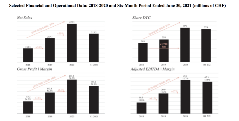 2020年全年和2021年上半年,On昂跑的毛利率分别为54.3%和59.3%;调整后 EBITDA分别为4980万瑞士法郎和4730万瑞士法郎。