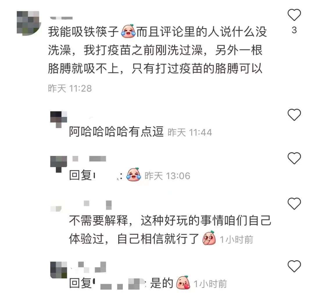 评论里一些用户也跟风测试:“我接种完后也可以吸起细小的铁片”、“有磁性是真的,我和我老公惊呆了”。