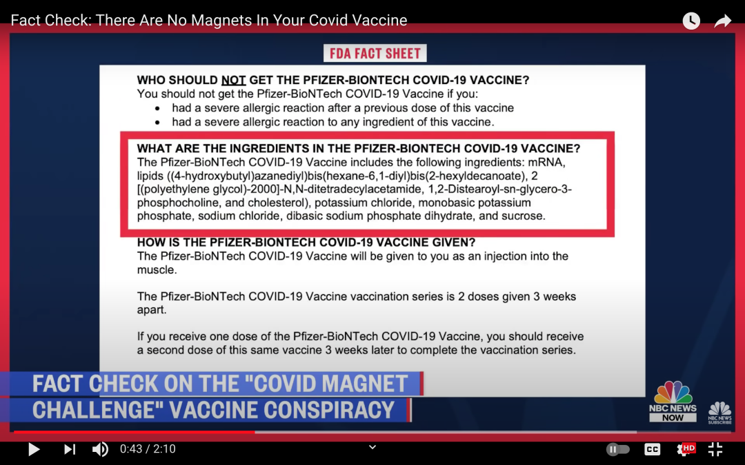 [2] NBC News. (20201). Fact Check: there are no magnets in your Covid Vaccine. YouTube. https://www.youtube.com/watch?v=7oGofOuai1k