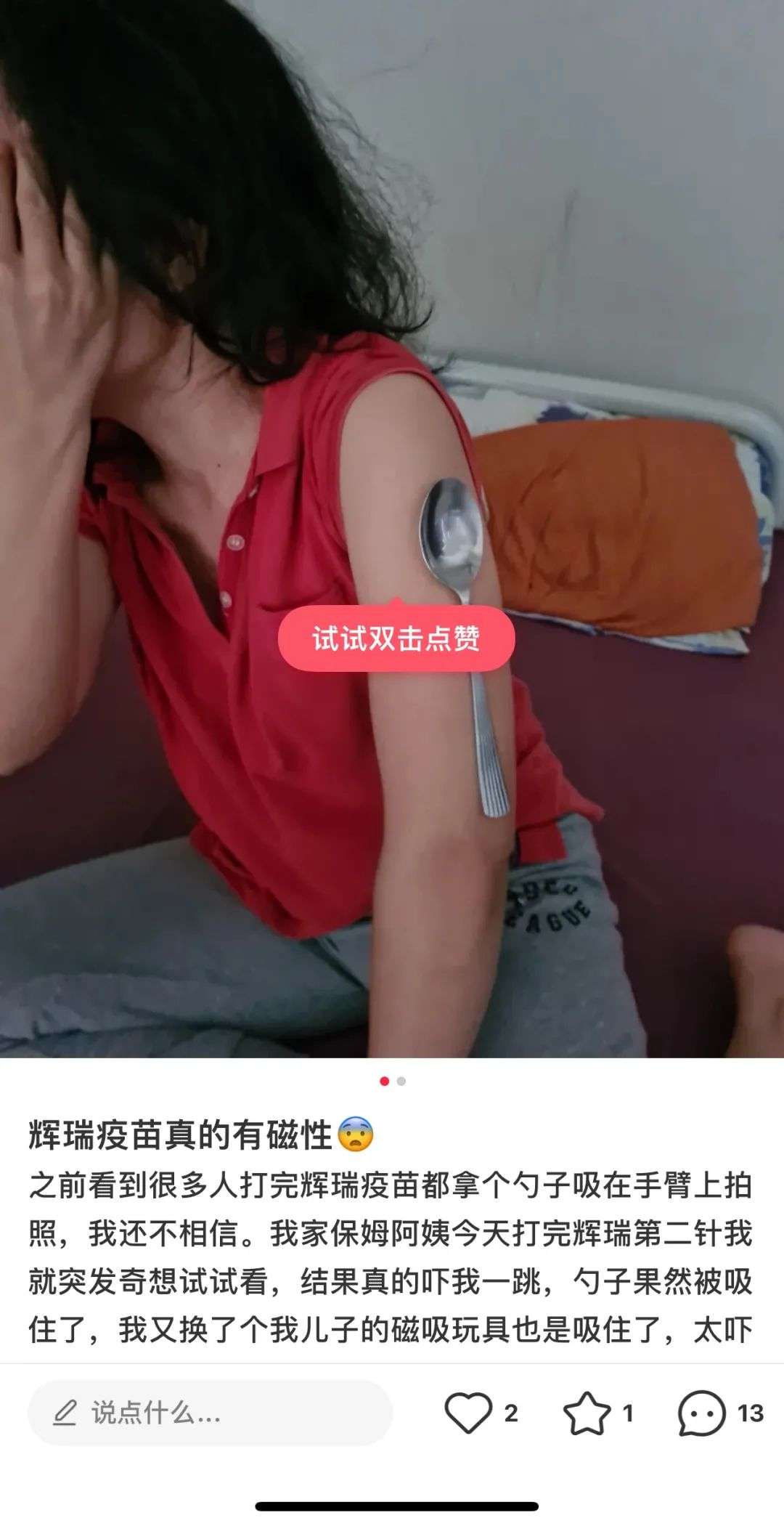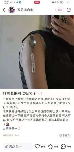最近,小 X 书上冒出了一些关于辉瑞新冠疫苗的帖子。一些用户宣称,自己在打完疫苗后,胳膊上的注射处产生了磁性,甚至可以吸附铁勺。在他们发出的照片里,接种过疫苗的大臂上紧贴着一把金属勺,旁边没有任何支撑。为了证明疫苗真的能给人加磁,有人还做了左右胳膊对比,没打过疫苗的胳膊对勺子毫无反应。