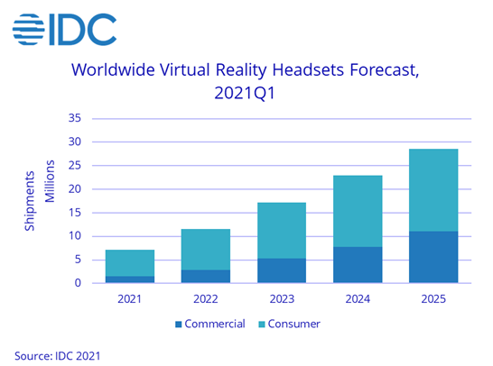 根据国际数据公司IDC的数据,今年第一季度全球VR头显设备出货量和去年同期相比增长了52.4%,在2021-2025年间,全球VR头显设备出货量有望达到约41.4%的年均增速。行业数据显示,中国VR产业的市场规模在2020年达到了413.5亿元人民币,2023年预计将达到1051.6亿元。