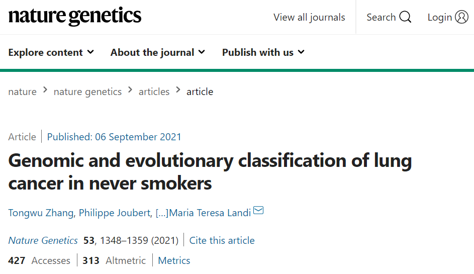 相关研究以“Genomic and evolutionary classification of lung cancer in never smokers”为题,发表在最新一期的 Nature Genetics 杂志上。