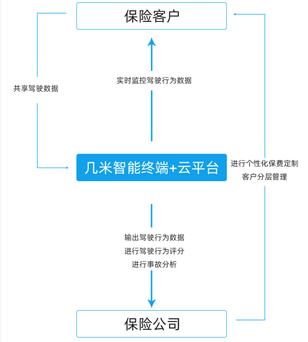 作为UBI车险整体解决方案提供商,几米物联形成了智能终端+云平台的软硬件一体化产品与服务体系。其基于车联网技术采集车辆位置、状态、里程以及驾驶行为等多维度数据,再由云端服务器进行分析与运算,为保险机构制定个性化保险产品提供精细化定价依据。