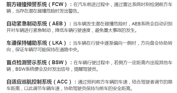 今年初,美国权威杂志《美国消费者报告》公布了目前主流的主动安全系统,主要包括FCW、AEB、LKA、BSW、ACC、ADAS等。