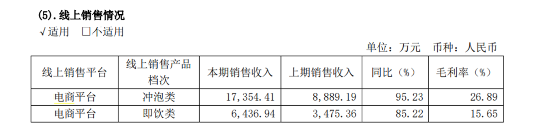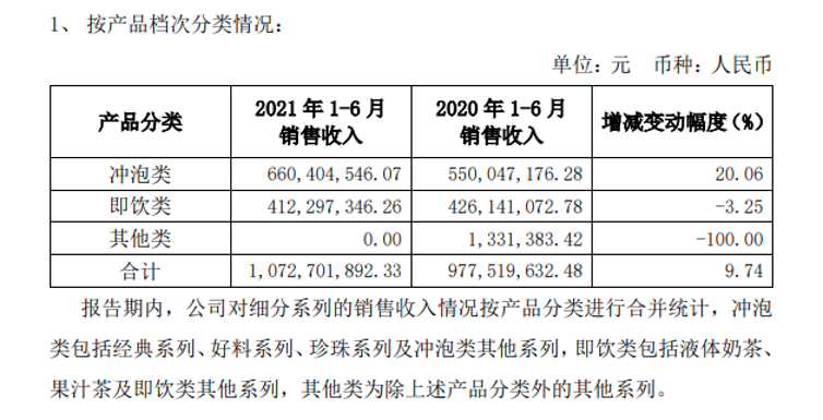 报告期内,即饮类奶茶收入达到4.12亿元,占总收入的38.44%,与上年同期相比不升反降。毛利率方面,18.35%的水平甚至不及传统冲泡业务40.61%的一半,丝毫显示不出第二引擎应有的能量。