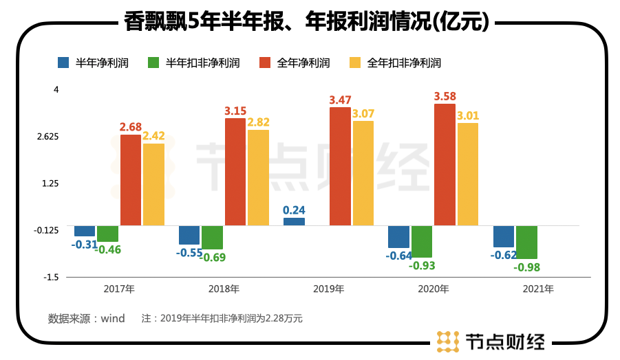 值得注意的是,这已经是香飘飘近五个半年报中的第四次亏损,公司仅在2019年Q2略有盈余,净利润达到2352.96万元,扣非后净利润仅为2.28万元。