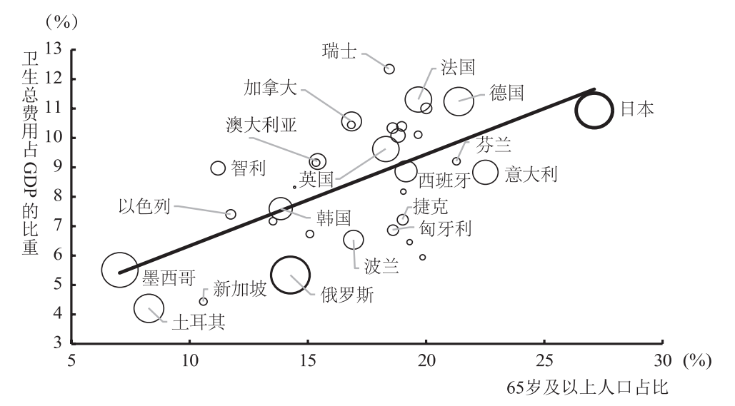 与养老金不同,患病、失能等健康风险在人群中的分布是不均匀的,个人很难以储备资金的方式有效应对。因此,需要在社会层面建立风险共担机制来解决医疗筹资问题。从各国数据来看,医疗费用的上涨一般都显著快于人均 GDP 的增长。随着劳动年龄人口减少,老龄人口占比不断增加,各国政府都将承受医疗支出快速上涨的巨大压力。为医疗健康支出筹资是世界难题,需要复杂的社会和商业保险机制,以保证成本、可及性和服务质量三者的平衡。与世界发达国家相比,中国将面临更多的挑战。中国人口基数大、生育率下降快,导致人口老化持续加速。现行的养老保障体系、医疗保障制度难以匹配人口年龄结构转变所带来的需求。尽管中国人口的预期寿命增长迅速,但是人均收入及储蓄仍与同时期的发达国家存在较大差距。2020 年中国 65 岁及以上人口占比达13.5%,人均 GDP 为 1.05 万美元,而日本、韩国在同等老龄化水平时,人均 GDP 都超过了 3 万美元。