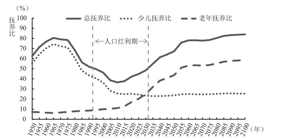 早期的经济学家主要关注人口规模对经济的影响,二战后的经济学家则更聚焦于人口结构对经济的影响,其中关于人口红利的研究是最为深入的。人口红利是指在人口转变过程中,劳动年龄人口数量和占比增长快于其他年龄组人口,总抚养比下降,从而产生一种对经济的促进作用。通常认为,人口总抚养比低于 50% 的阶段即为人口红利期。传统的人口红利主要体现为人口数量上的红利, 也被称为第一次人口红利。