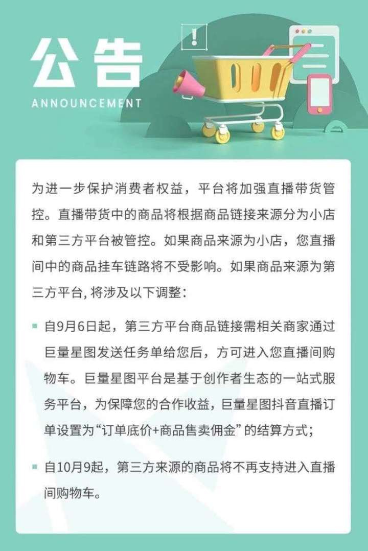 但现在,抖音在逐步提升电商闭环的交易占比。去年8月,它就将直播间第三方平台来源商品的服务费比例提升到了20%。而抖音小店的比例只有5%。到了10月,抖音在直播间正式禁止了主要为淘宝导流的电商外链。
