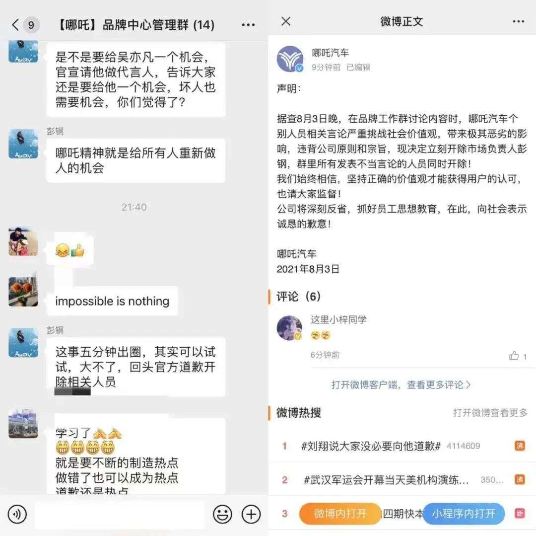 今年8月初,哪吒汽车当时的市场负责人“彭钢”在微信群内建议:“是不是给吴亦凡一个机会,官宣请他做代言人,坏人也需要机会”,理由是“这事五分钟出圈,其实可以试试,大不了,回头官方道歉开除相关人员”。这项提议还得到了群友“做错了也是热点”的回应。
