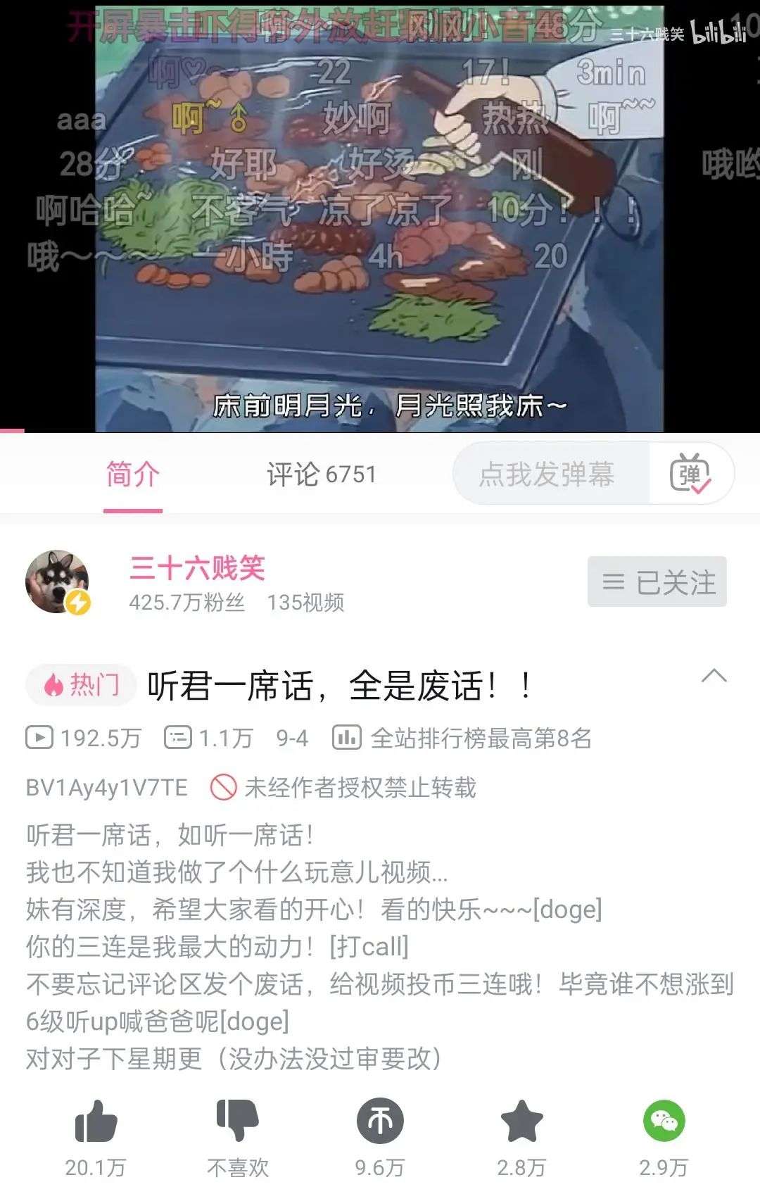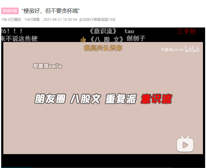 UP主司墨尧发布了题为《梗虽好,但不要贪杯哦》的视频,播放量高达196.8万。UP主总结,“我这里指的是把所有梗都搞在一起,导致说了很多却没有意义的缝合怪,适度玩梗是OK的。”