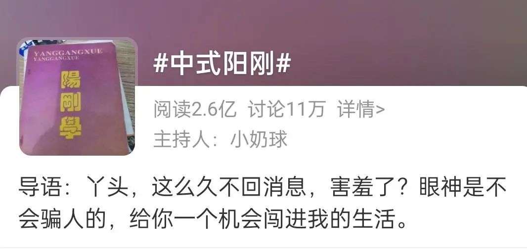 丫头文学出自微博上一些女性对身边普信男油腻发言的控诉。从三三两两的私人吐槽开始,“丫头文学”逐渐成为普信男说话方式的代名词。目前,#中式阳刚#的微博阅读量已达到2.6亿。
