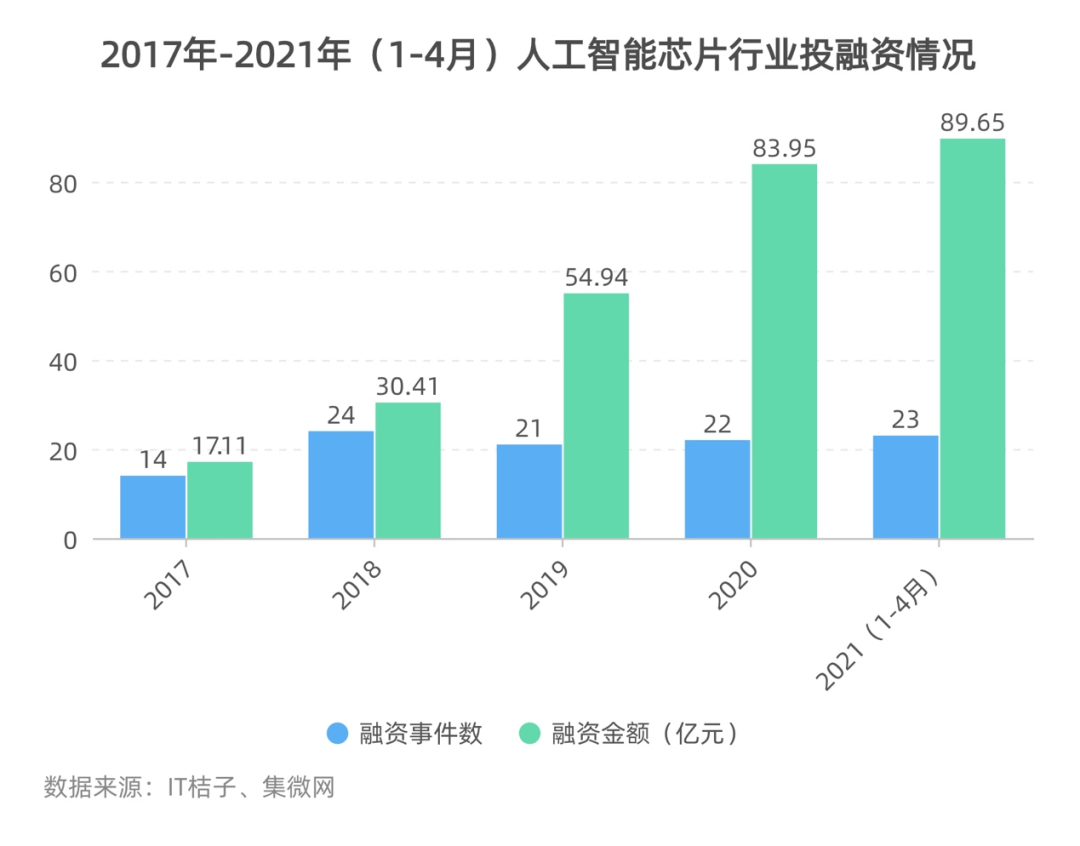 真金白银不断涌入。根据第三方分析机构集微咨询统计,仅2021年前四个月,中国AI芯片行业的投融资规模达到89.65亿元,涉及投融资事件20多起。