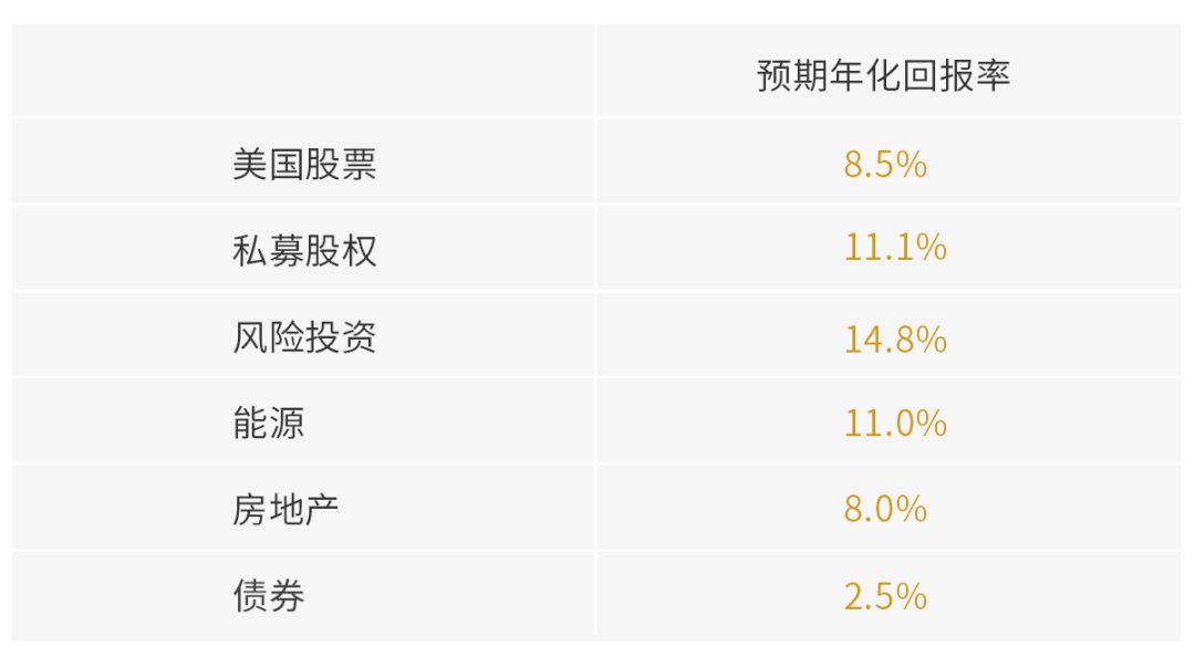 尽管短期来看,投资具有很大的不确定性,但长期来看,每个资产类别都有自己的运行规律,因此业界对于每一个资产类别都有一个长期的预期回报率。例如这张表格所示,美国股票市场从长期历史来看,平均每年产生8.5%的回报率,这就是说,即使投资美国股票指数,只要持有的时间足够足够长,它就会产生平均每年8.5%的业绩,而私募股权、风险投资、能源这三个资产类别则比股票有更高的长期收益,这一定程度上是因为三者都有更长的锁定期,意味着投资人通过牺牲一定的流动性可以获得更高的回报,这是耶鲁模式长期跑赢巴菲特模式的第一个重要原因。