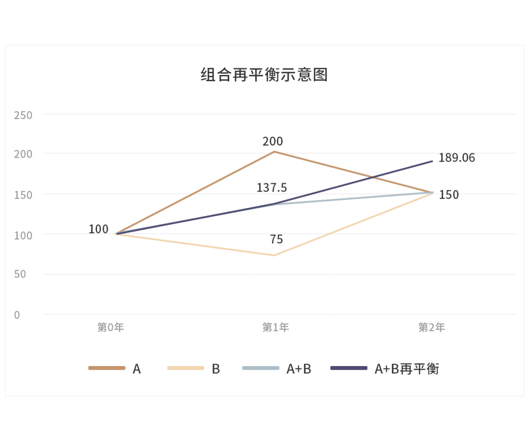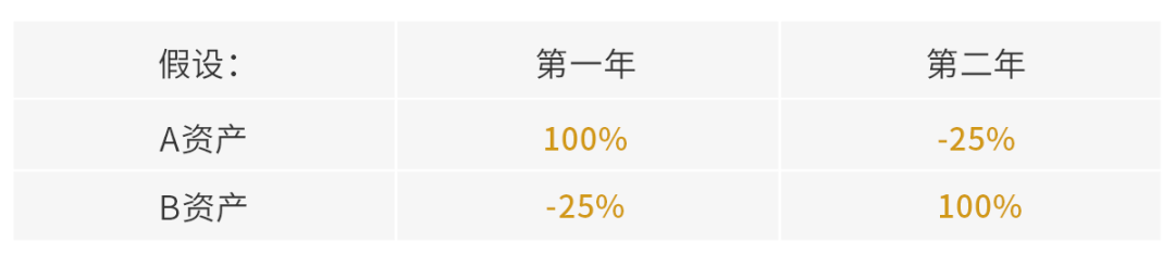 假设两个资产类别A和B,A在第一年上涨100%,第二年下跌25%;B在第一年下跌25%,第二年上涨100%。