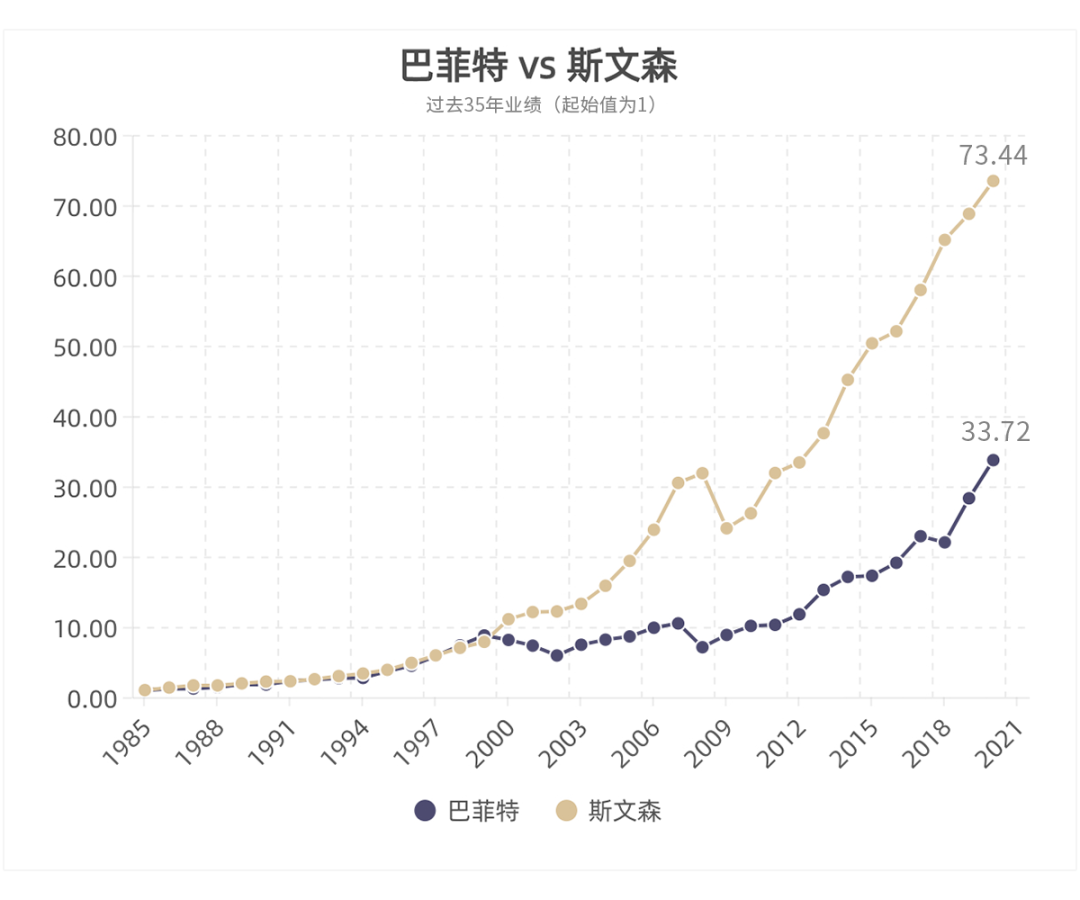 在过去的35年里,从业绩上来看,巴菲特所领导的伯克希尔哈撒韦产生的年化收益是10.57%,而斯文森所领导的耶鲁大学基金会年化收益是13.06%;而从风险 角度来看,伯克希尔哈撒韦的波动率是14.76%,耶鲁大学基金会的波动率是11.37%。斯文森的耶鲁模式在承担更低风险的情况下,每年领先了2.49个百分点。