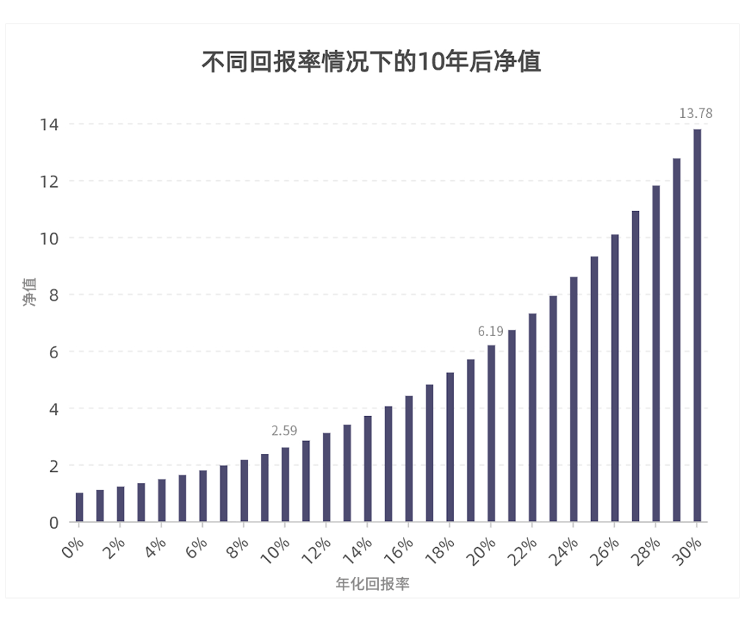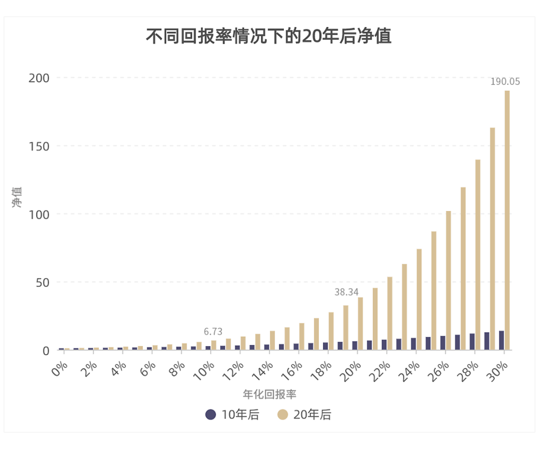 尽管很多人都理解复利的概念,但是对于复利长期能产生多大的影响,应该大部分人都没有很清晰的认识。这里我们举两个例子。第一个例子,假设我们现在投入一亿美金。10年后的价值会是多少呢?如图所示,结果跟回报率呈现指数关系。如果每年的回报是10%,那么十年后一亿美金会变成2.6亿,而如果每年的回报是20%或30%,十年后会变成6.2亿或13.8亿。以此类推,二十年后的价值又做了一次指数级的放大。在不同回报率的情况下,最终结果出现了更加明显的分化。