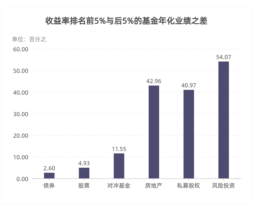 事实上,同一类资产类别之间的回报差异非常大,下图展示了不同的资产类别中,业绩排在前5%的基金与后5%的基金的年化收益差距,可以看出,风险投资基金的收益差距最大,而债券最小。收益率分布差距越大,说明市场的有效性越低,基金管理人的主动管理能力就越能发挥作用,取得超越行业平均水平的收益。这也是为什么在耶鲁模式中,风险投资、私募股权和对冲基金占据组合的大部分,因为斯文森相信,通过挑选优质的基金管理人,可以在这些资产类别中创造出更高的超额收益。