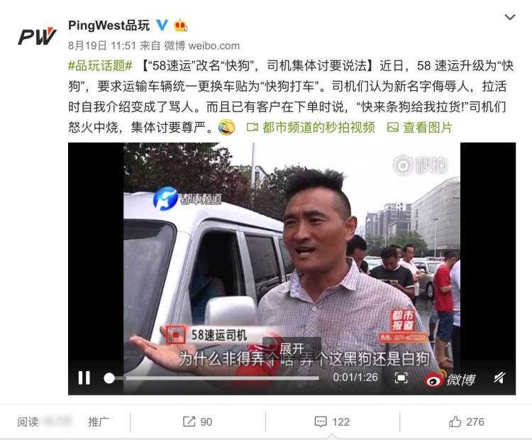 从“58速运”改名为“快狗打车”,这个名字被1亿多人知道,新增客户达3倍。虽然快狗发声明称,这个中文品牌名是源于合并公司GoGoVan。但面对“来条狗给我拉货”的订单备注,快狗打车司机们感到十分不满。