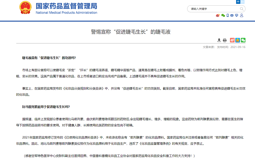 今天(9月16日),国家药品监督管理局在“科普知识”一栏发布了一篇文章,题为《警惕宣称“促进睫毛生长”的睫毛液》,文中对“睫毛增长液具有‘促进睫毛生长’的功效吗?”、“比马列素能用于促进睫毛生长吗?”这两个问题进行了科普和回答。