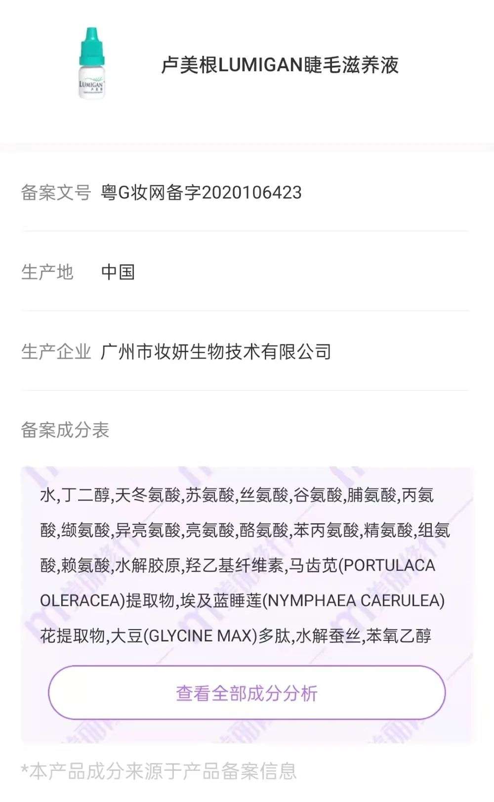 据了解,目前国内在售名为Lumigan的产品,淘宝上有一家同名旗舰店:卢美根旗舰店,主要销售Lumigan睫毛增长液,产品外观与Lumigan眼药水十分相似。然而,记者查询美丽修行app后发现,该产品显示国产备案(备案已注销),生产企业为广州市庄妍生物技术有限公司,且产品成分中不含马列前素。