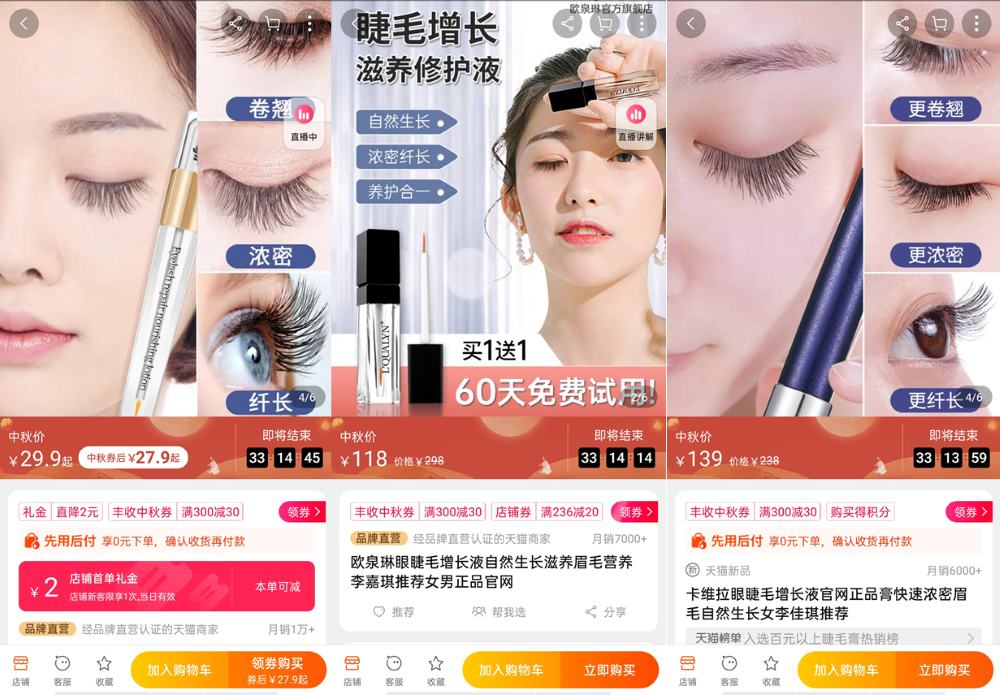 记者注意到,淘宝上的一些“睫毛生长液”产品宣传较为夸张,而且产品的价格也参差不齐,从20几块钱到100元以上都有,销量颇高。部分产品甚至通过图像处理来营造一种能够促进睫毛浓密生长的效果,宣传中通常涉及到“滋养”、“温和”、“植物成分”等关键词。
