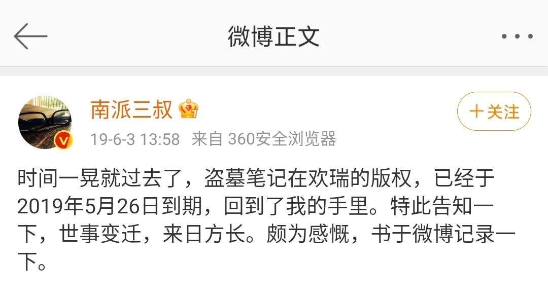 2019年6月,南派三叔在微博发文告知粉丝,《盗墓笔记》在欢瑞的版权已经到期,也就是说,《盗笔》电视剧改编权已经回到了南派三叔手上。几天后,由侯明昊与成毅主演的《盗墓笔记之怒海潜沙&秦岭神树》播出,这部剧由腾讯与欢瑞联手打造,并未引起太多关注,豆瓣5.7分草草收场。