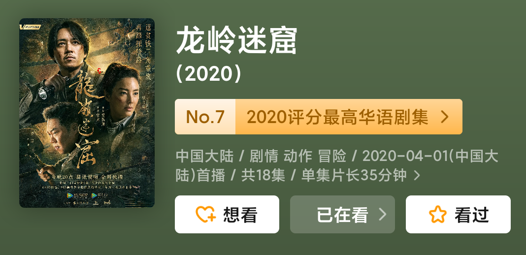 这一次的选角最受观众认可,“铁三角”终于成型,与此同时,编剧杨哲团队还大胆的加入多线故事,让剧情“饱满”起来,再加上过硬的场景和特效,《龙岭迷窟》位列豆瓣2020年华语剧集的评分第七名,已是目前市面上所有盗墓题材剧集中的口碑“TOP”。