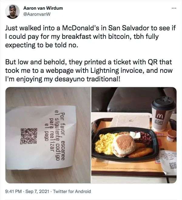 当天,在萨尔瓦多的星巴克、麦当劳、必胜客等多家企业宣布接受比特币支付。总统 Bukele 的 Twitter 一直轮播相关消息,似乎比他本人还兴奋激动。萨尔瓦多政府先后买入 550 个比特币,耗资约 2800 万美元。
