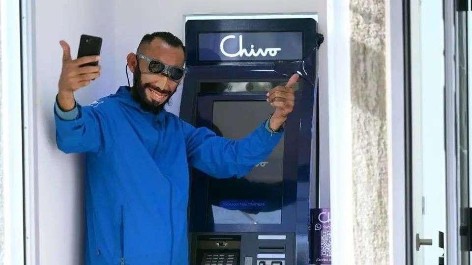 总统 Bukele 的支持者,在跟 Chivo 的 ATM 机合影