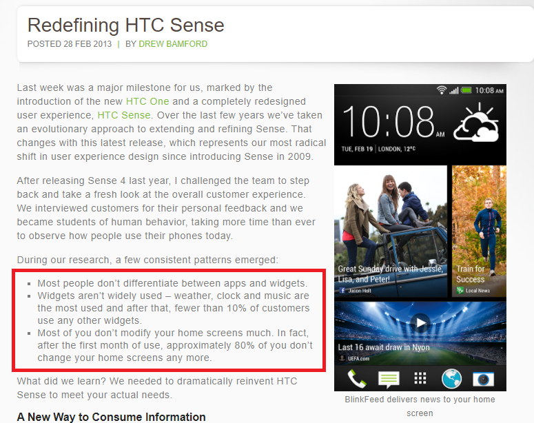 HTC 用户体验助理副总裁 Drew Bamford 在 2013 年的一篇博文里,一阵见血地指出了大多数桌面小组件的问题所在: