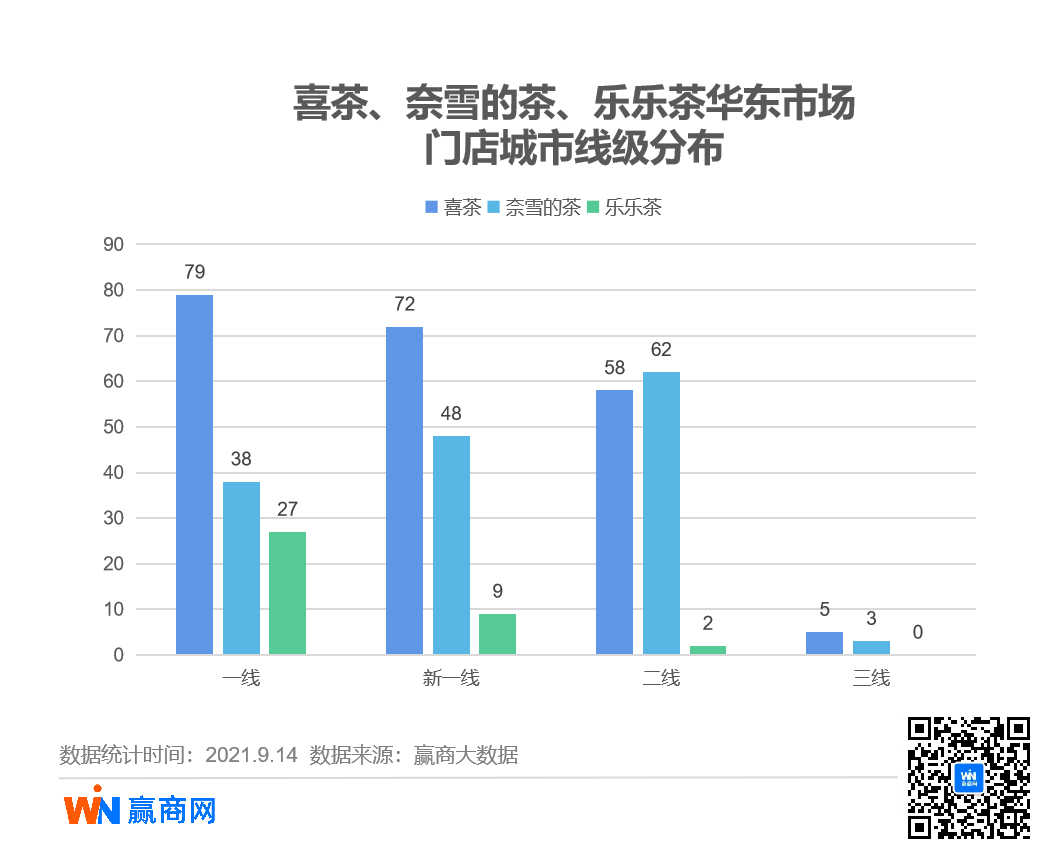 赢商大数据对5万方以上购物中心踩盘数据显示,华东市场喜茶二线城市58家,三线城市5家;奈雪的茶二线城市布点最多,为62家。二者在华东三线城市的布局,都相对空白。