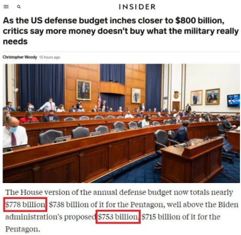 △“商业内幕”网站:众议院版本的2022财年国防预算总额接近7780亿美元,远高于拜登政府提出的数额。