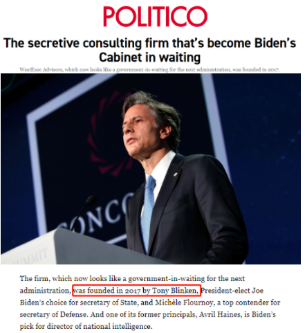 △“政客”新闻网:在拜登竞选总统的过程中,后来成为拜登政府国务卿的布林肯就在2017年参与创建了WestExec资询公司,为拜登提供了大笔助选资金,以便日后帮助军工企业谋取利益。