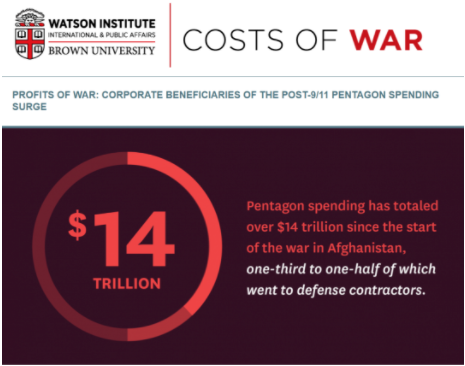 美国布朗大学近日发布的“战争成本”研究报告显示,自2001年发动阿富汗战争以来,美国军费支出累计超过了14万亿美元,其中的“三分之一到一半”落到了美国军工企业手中。
