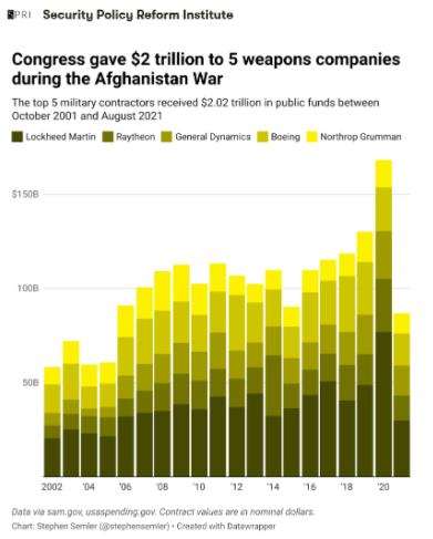 而美国独立智库“安全政策改革研究所”(SPRI)公布的数据显示,在20年的“反恐”战争中,洛克希德·马丁公司、雷神公司、通用动力公司、波音公司和诺思罗普·格鲁曼公司这五大美国军工巨头与美国国防部签署的合同占比多达三分之一,获取的国会拨款总额超过2万亿美元。