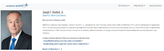 △洛克希德·马丁公司官网资料显示,曾在2013年至2014年间担任驻阿富汗美军指挥官并于去年退休的陆战队上将小约瑟夫·邓福德已经成为这家美国最大军火商的董事。