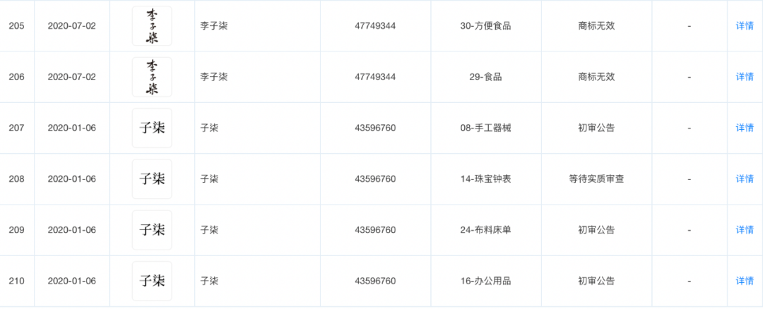 杭州微念也拥有小部分李子柒品牌相关知识产权。但开菠萝财经查询发现,其旗下和李子柒相关的商标基本处于两种状态,要么是商标无效,要么是等待实质审查。