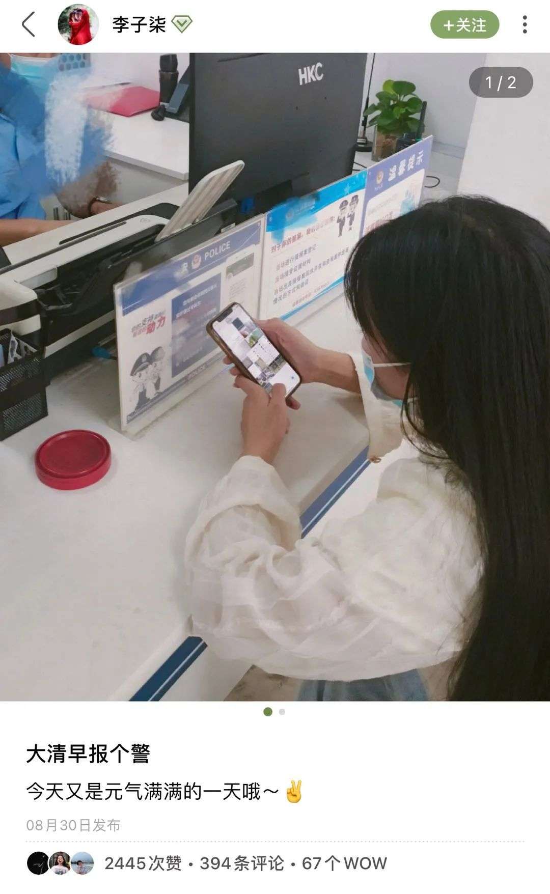 李子柒的粉丝最先嗅到危险的气息,等待视频更新的他们在8月30日等来的是李子柒在绿洲账号发布的状态,“大清早报个警”,配图是一张她坐在警察局里的侧脸照。