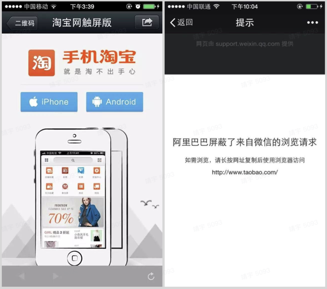 2013 年 11 月,用户在微信中打开淘宝链接,会被导向手淘下载页,随后微信上线右侧用户提示页面