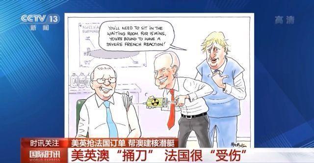这张漫画就展示了美英澳早已知道会对法国造成什么样的影响。漫画中,美国总统拜登给澳大利亚总理莫里森打预防针,约翰逊在后面说:“你需要在这里观察15分钟,法国马上会有强烈反应。”