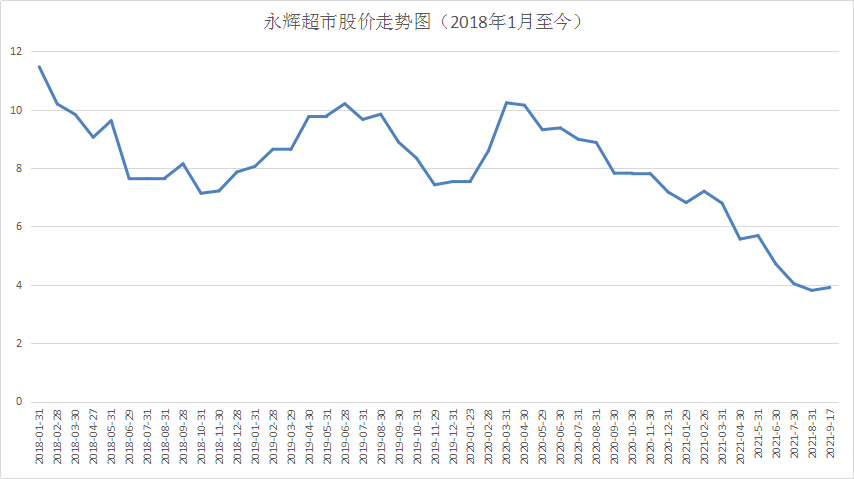 但资本市场并没有对此给出积极的回应。2021年以来,永辉的股价一路走低,从年初的7元左右跌至不到4元,截至9月17日,永辉超市的股价为3.91元。