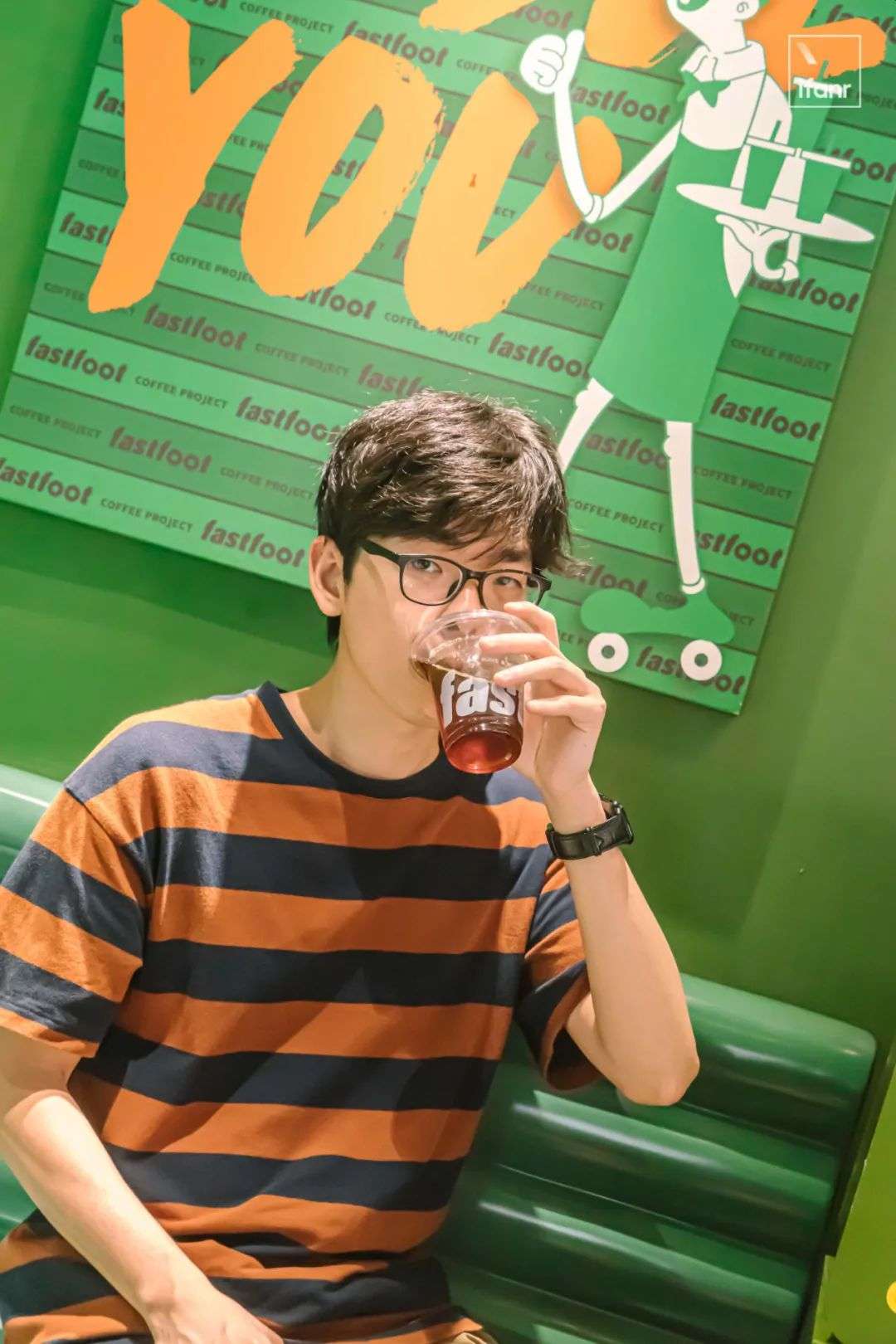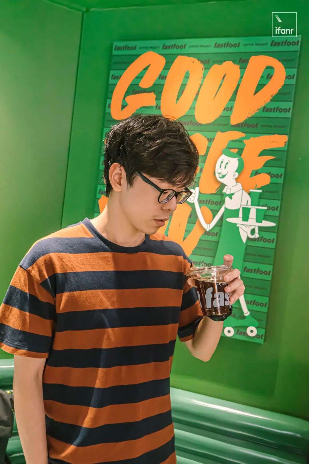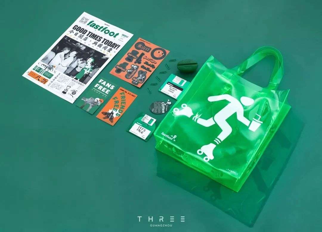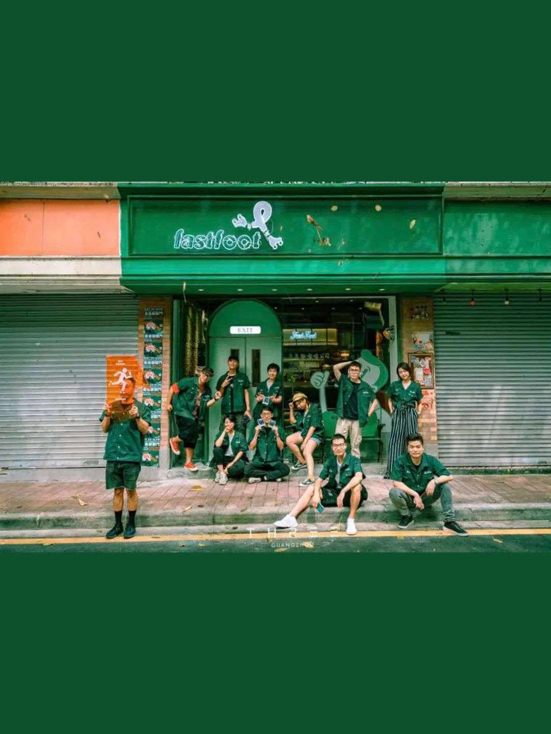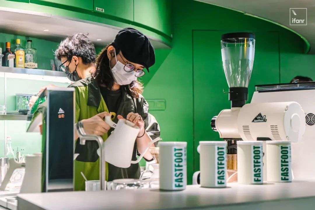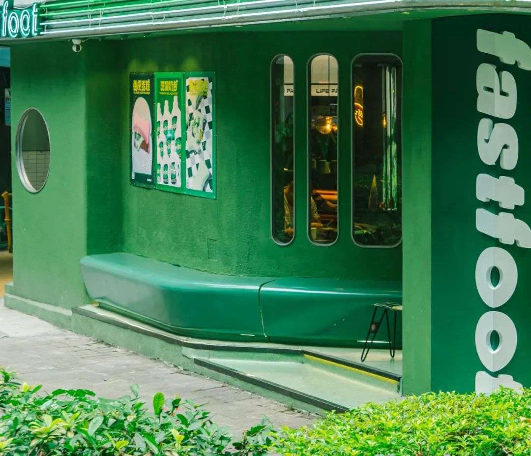 穿过广州市中心的老居民楼,远远就可以看到这家被绿色浸染的咖啡店,折叠在墙角是一行大字号的「fastfoot」,由品牌名「急急脚」转译而来。